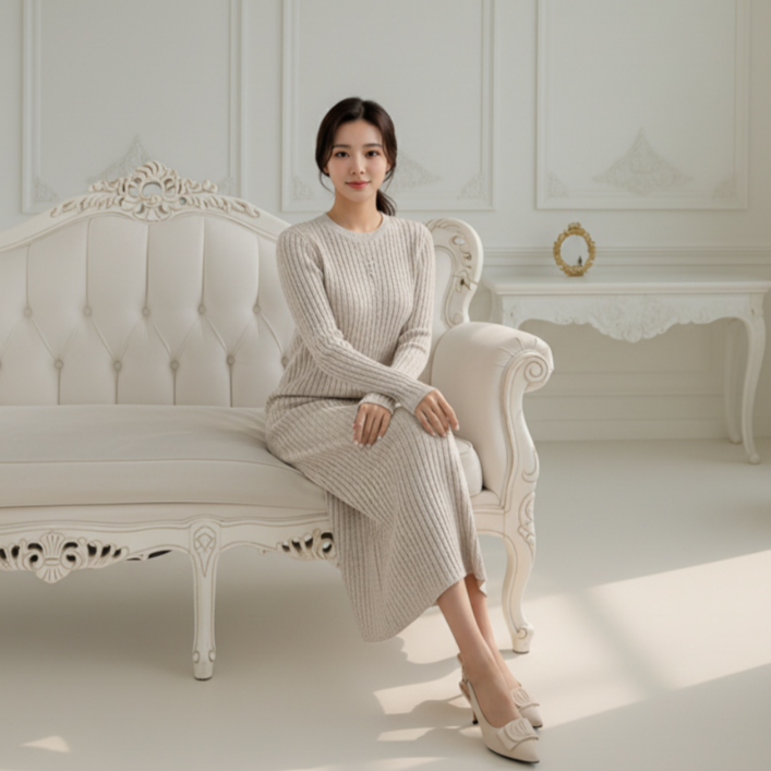 쁘띠엘라 발목기장 롱 원피스 라운드 골지 니트