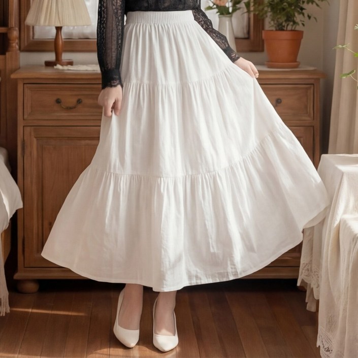 라뷰드 캉캉 플레어 밴딩 롱스커트 여성 밴딩 A라인 플리츠 치마 2단 레이스 플레어 하의 안감 내장 하웨이스트 물결 롱치마
