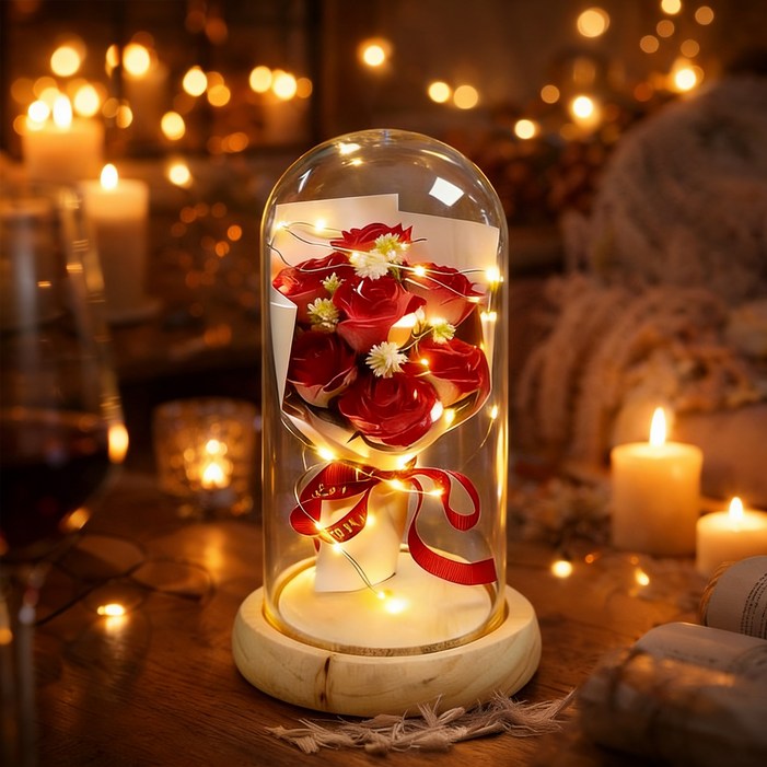 Novah 영생화 유리돔 장미 LED 무드등 비누꽃 로즈데이 선물용 메시지 카드 포함