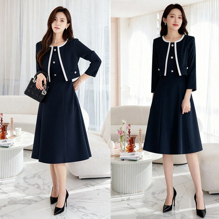 비비디아 여성 레이어드 배색 자켓형 플레어 원피스 하객룩 오피스룩 5588