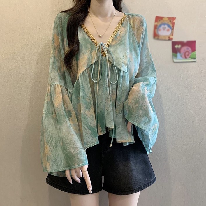 ROYALBELLE 여성 우아한 스팽글 디테일 언밸런스 프릴 러플 긴팔 쉬폰 블라우스 Z0091617